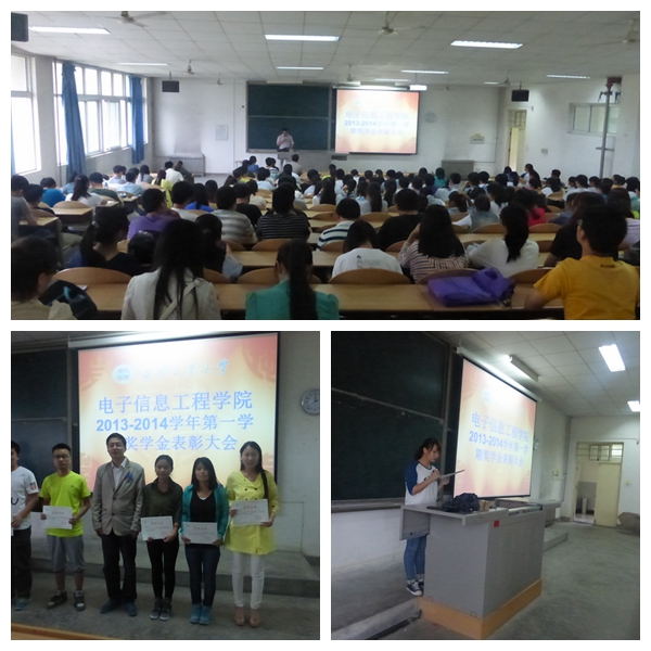 5月23日下午,电信学院2013-2014学年第一学期学业奖学金表彰暨学风建设总结大会在教1-101教室隆重举行。出席大会的老师有电信学院各年级辅导员、各班获奖学生代表及部分学生党员参加了此次大会。大会由电信学院辅导员组长周新梁老师主持。