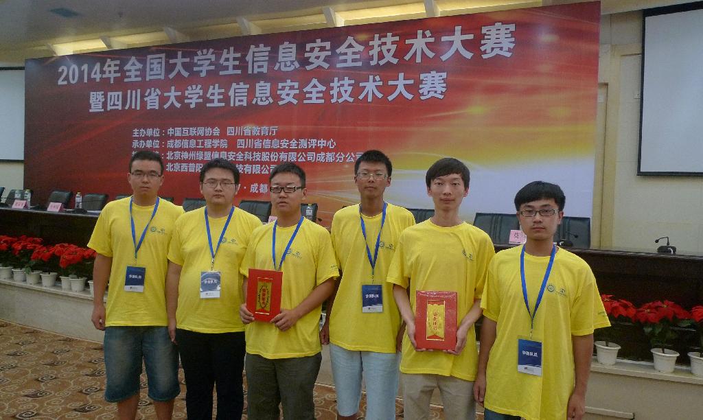 据悉,“2014年全国大学生信息安全技术大赛”由中国互联网协会主办,成都信息工程学院、四川省信息安全测评中心承办,于2014年7月26日至7月27日在成都举行。本次竞赛吸引了来自全国各地的70支队伍、200余人参赛。我校由何文杰、苟志文担任队长的代表队分别以总分第3名和第6名的成绩,双双荣获一等奖。