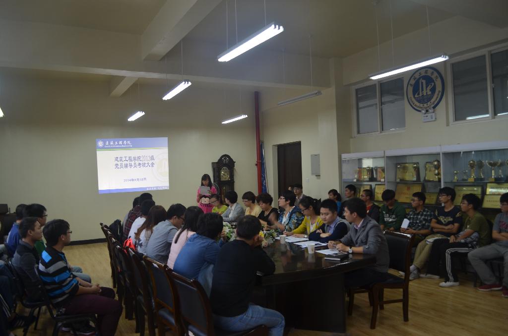 2014年9月18日晚,建筑工程学院2013级党员辅导员考核大会在学院会议室隆重召开。学院党总支书记黄越、党总支副书记张艳霞、各学生党支部书记、各年级辅导员、2013级党员辅导员、2013级各班学生代表、2014级即将聘任党员辅导员及2014级各班学生代表参加了会议。