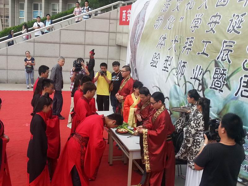 “纪念先师孔子2565周年诞辰暨西安工业大学拜师礼”大型文化体验活动于2014年9月26日下午在西安工业大学经纬广场隆重举行。本次活动由校团委主办,人文学院、国学社承办。西安工业大学教务处主任齐华、人文学院党委书记雷晓青、人文学院科研院长邰科翔、人文学院教学院长赵琳,以及学院全体老师和学生出席了本次活动。