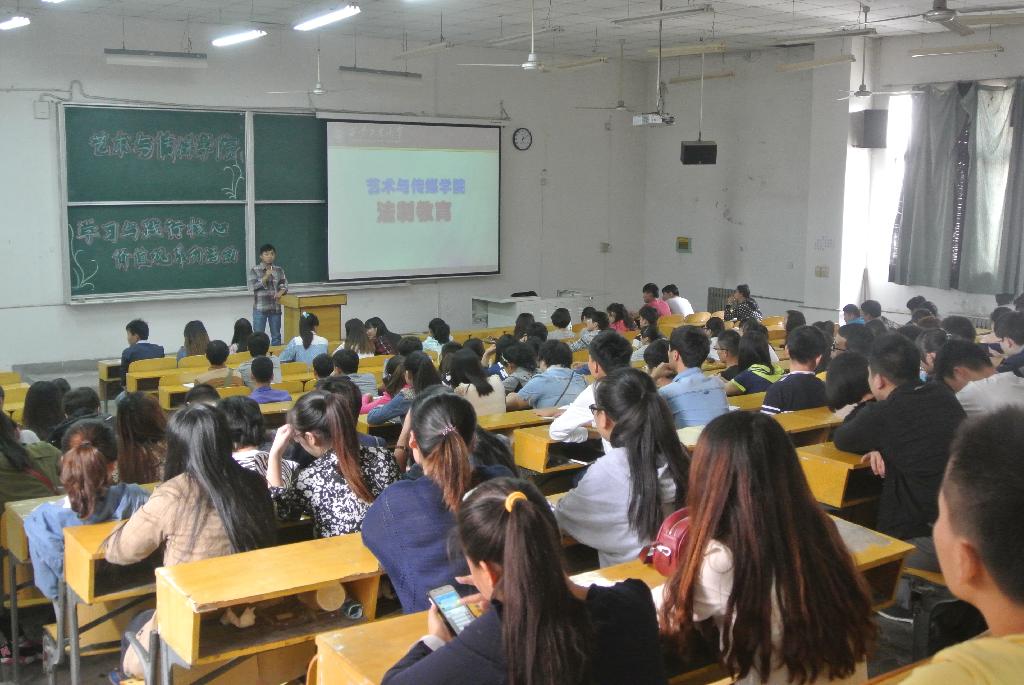 为了积极响应国家依法治国的纲领,增强我院学生的法律意识,艺术与传媒学院于2014年9月26日14:00在我校金花校区教6楼J3教室举办了“法制教育”讲座。此次讲座由我院杨海斌老师主讲,全院三百余名学生参加了讲座。