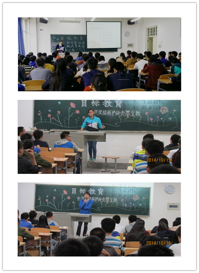 首先,王老师向同学们介绍了目标教育的四个方面,从成人教育、成才教育、成长教育、成功教育进行分析,让同学们更加明白了目标教育的重要性。其次,为了让同学们更加明确如何度过大学生活,王老师特别邀请到我院11级“十佳大学生”张卓然和已签约百度公司的张申翔给同学们做精彩的演讲。张卓然从价值目标和生活目标给14级同学做出了详细介绍,而张申翔从学业目标和职业目标给学生们正确的指引。最后,刘老师对此次班会进行总结,并希望同学们能够通过这次班会,树立正确的目标,让自己的大学更充实。