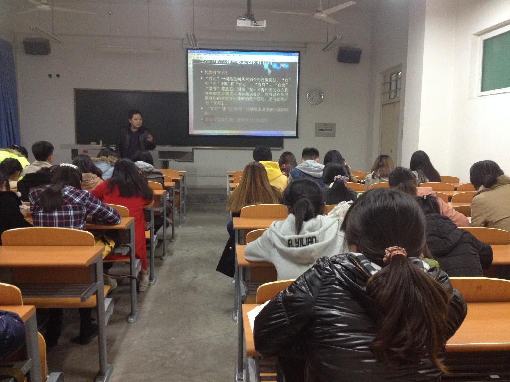 为推动和细化大学生学习、贯彻和落实党的十八届四中全会精神,进一步强化大学生的法律意识,11月18日晚7:00,外国语学院邀请校人文学院法律系王锋老师在教3-206为同学们讲解了有关法律诉讼方面的知识。