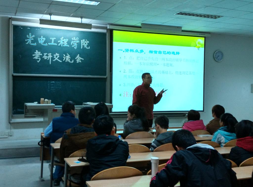 为了加强学院研究生与本科生的交流,帮助本科高年级学生更多的了解考研复习信息,光电工程学院于2014年11月19日晚19:00在教2—206举行了考研经验交流会。学院2014级研究生费海明、孙萍萍、张易和许黄蓉在会上进行了经验交流发言。