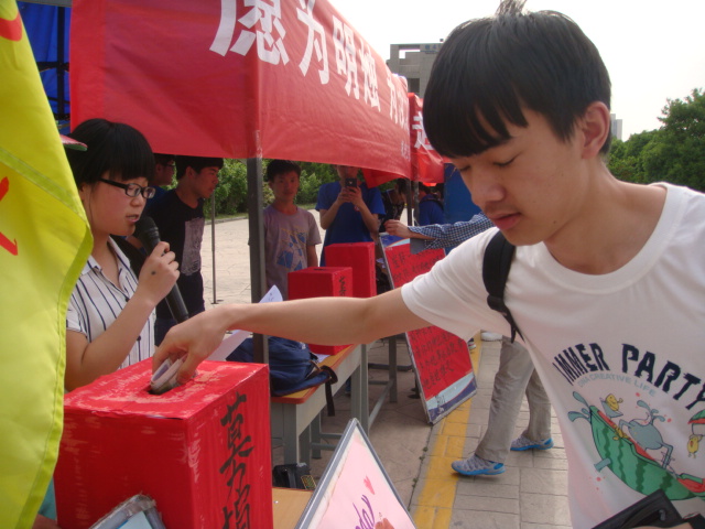 2015年5月5日,机电“阳光”青协在经纬广场为河南科技大学白血病患者崔静同学举行爱心募捐活动,