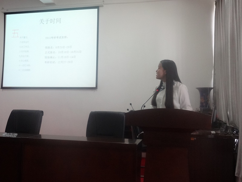 首先,大四学生干部薛杰夫对此次交流会进行了简单介绍,希望给前来交流的大三同学提供有效帮助。接下来,2011级考研成功的6位同学从不同角度与大家分享成功与挫折。王文媛给大家介绍了如何度过考研迷茫期,在决定是否考研这个问题上给大家做了深入的分析。刘婷、侯林等同学给大家介绍了考研复习需要注意的几个关键点,包括英语、政治和专业课复习的侧重点。强调复习应该稳步进行,制定好详实的计划,不能急于求成。秦琰从考研的初试和复试这个角度给大家讲了一些应试技巧。她特别强调了考研之前要给自己多计划一条路,告诉大家调剂需要满足的条件,相应的准备工作都要提前做到位。对外汉语专业的史珂同学根据自己考研的切身体会,给在座学生提出具体建议,包括学校的选择,笔试答题技巧,复试面试如何应对等。