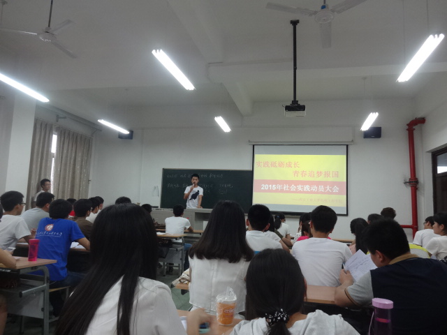 2015年5月18日,机电工程学院在工2-502教室举行2015年暑期社会实践动员大会。出席本次大会的有机电工程学院青协主席潘兵、组织部部长胡俊杰、体育部部长杨浩林以及13级、14级班长和团支书。