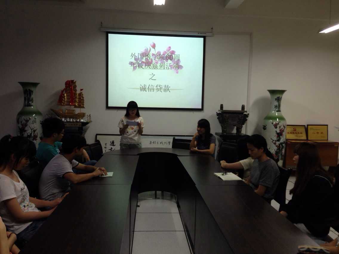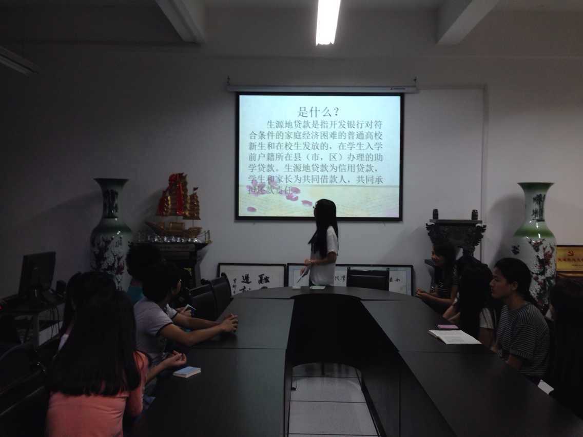 5月20日晚7:00,在教5-413,外国语学院组织开展了以“加强学生资助诚信教育,构建以诚信为荣的校园氛围”为主题的诚信贷款活动。学院团委书记、资助工作负责人王丹丹老师、大一至大三所有生源地贷款的学生参加了活动。