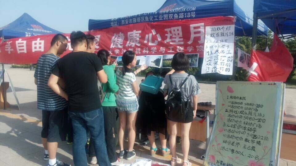 2015年5月,计算机学院学生会在经纬广场举行了以“畅呼吸,享自由,悦心灵”为主题的5.25心理健康月系列活动。活动主要有“你拍我来猜”,“心理趣味游戏”,“心理团体辅导”三大板块,吸引了诸多同学前来观看参与。