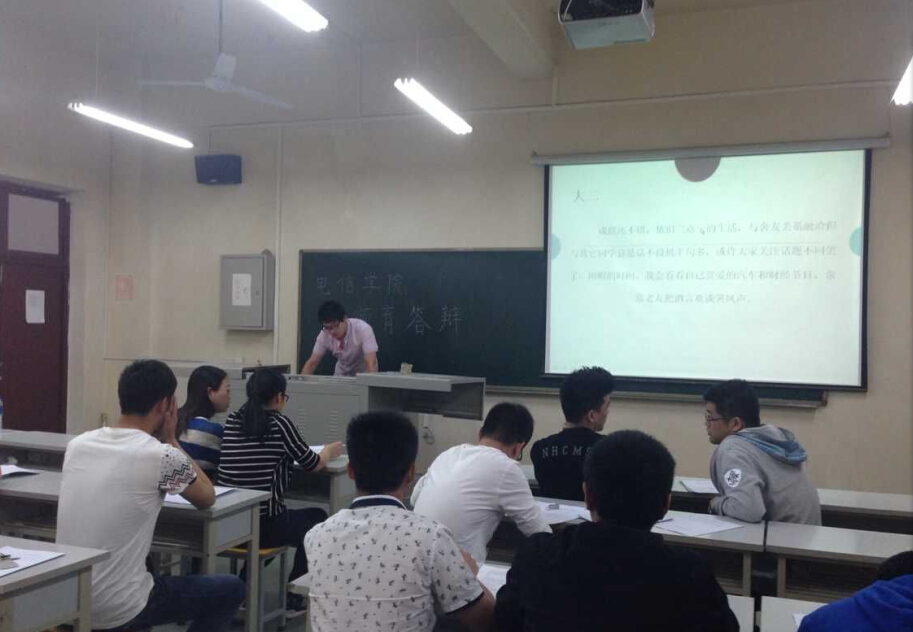 电信学院2015届本科毕业生共有21个班级,613名学生。德育答辩分为班级答辩和院级答辩两个环节。每位学生利用文字、图片和视频,通过PPT形式结合目标教育完成情况,与在场的老师和同学分享了各自的思想状况、生活安排、学习情况、参加各种校园文化活动、人生的感悟和求职等方面的收获和感悟,并查找存在的问题与不足,展望美好愿景,树立正确的思想道德观念,合理规划职业生涯。