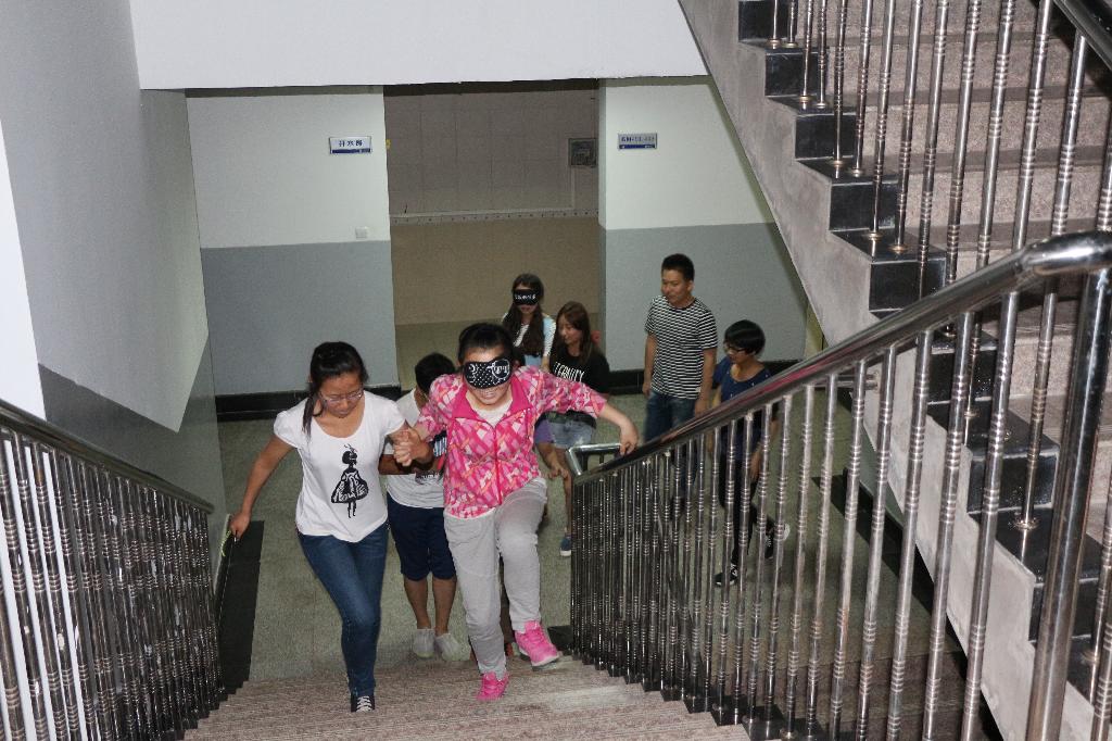 活动一开始,王老师先向同学们简单介绍了心理团体辅导的概念、主题、环节等,让同学们明白此次活动的目的所在。在体检环节,王老师引出此次团体辅导的主题是“沟通你我他”,她通过“找零钱”热身活动,让同学们放松警惕,活跃了现场气氛,同学们也更加自如的投入到活动当中。接下来进行的是“心有千千结”,同学们通过团结协作解开自己系的结。最后进行的活动是“盲人旅行”,王老师分别让一个同学扮演盲人穿过障碍,之后通过盲人和伙伴一起穿过障碍,最让同学有深刻体会的是在同伴的帮助下,“盲人”穿过楼道,上下楼梯,回到教室。团体辅导的主要关键点在于参与者的分享与感悟,在这个环节,很多同学都认识到在平时与他人的沟通交往中,要学会换位思考,互相理解,要增强对他人的信任;在生活中要勇于面对,跨过心里的坎;在面对挫折时,要团结协作,攻坚克难。