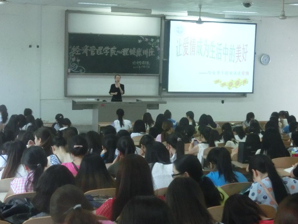 5月27日,西安工业大学心理咨询中心主任林晓萍应邀为我院做主题为《让爱情成为生活中的美好》的心理健康讲座,经管学院辅导员张玉玲、易亮及学院2011级全体女生参加了讲座。