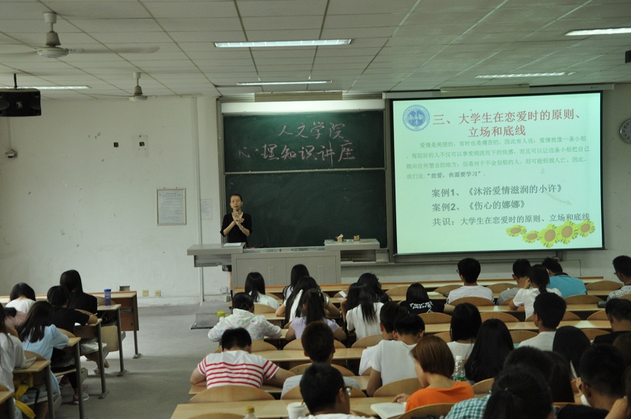 2015年5月28日下午,人文学院邀请思政部心理健康中心主任林晓萍老师为我院学生带来主题为 “我们的爱情”的心理知识讲座。讲座由学院团委书记杨艳老师主持,大一、大二辅导员和学生参加了此次讲座。