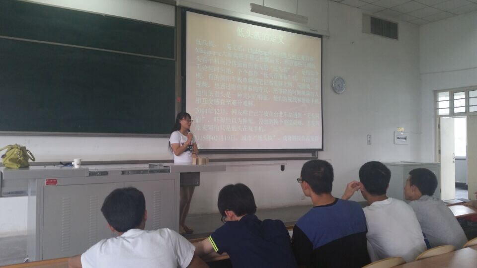 首先材料与化工学院辅导员张瑞红通过举例讲述了“低头族”的含义,就是指无论何时何地,个个都作“低头看屏幕”状,想通过盯住屏幕的方式,把零碎的时间填满的人。进而详细描述了低头族形成原因、影响以及危害,并说明了“低头族”的一些防范措施。她用网络流行语“世界上最远的距离不是天涯海角,而是我站在你面前,你却在玩手机”形象地描绘了反映了人们对人际交往中手机这个角色的复杂心态。张瑞红老师现场对每位学生发放关于“低头族”调查问卷。