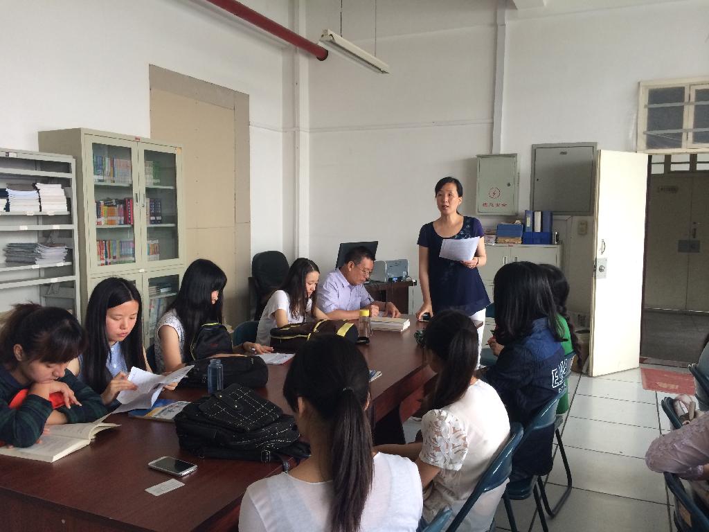 6月16日上午,外国语学院在学院阅览室召开了2015年暑期社会实践培训暨安全教育大会。学院党委书记张文孝老师、副院长王蕙老师、英语系主任张郁老师、团委书记王丹丹老师和英语系张玥老师分别对学院组织的4支社会实践队的学生进行了有关社会实践培训和安全教育。