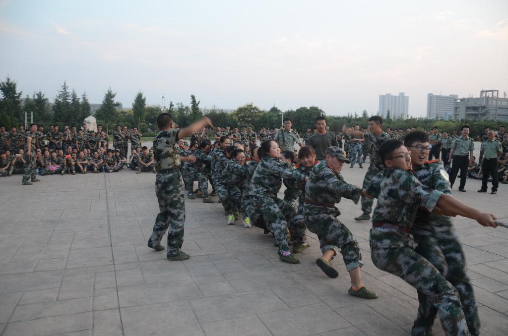在今年的军训中,经管学院独自成营,共有4个连队。在活动准备阶段,同学们积极踊跃,主动向连长报名,在精挑细选后各连选出了自己的最强20人阵容——15女5男。经过抽签,由31连对阵33连,32连对阵34连。当比赛的哨声响起,参赛队员们口中一起高呼着“一二,一二”,双手紧握长绳,憋足了劲拼命往后拉,各连长也在队伍旁边加油助阵,连内剩余的同学们自发组成啦啦队为本连人员加油。号子声、呐喊声,此起彼伏,飘荡在整个经纬广场上空。