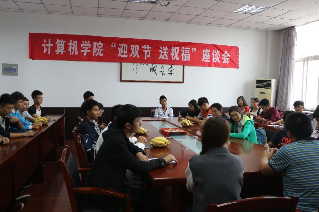 2015年9月25日中午,计算机科学与工程学院举办了“迎双节,送祝福”中秋节、国庆节座谈会。学院年级组长高金生、15级新生辅导员呼延晓蓉、15级学生干部以及贫困生代表参加了座谈会。