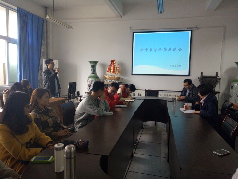 为了认真做好期中教学检查工作,全面了解学生学习、生活状况,解决教学运行过程中遇到的实际问题,外国语学院于11月5日12:30在教5-413会议室召开了期中教学检查学生座谈会。本次会议由辅导员范亚苗老师主持,日语系主任陈建明、高少敏、刘明老师,英语系张静华、雷华老师,学生各班班长、副班长、学习委员、团支书及学年班级德育成绩获奖者参加了座谈会。