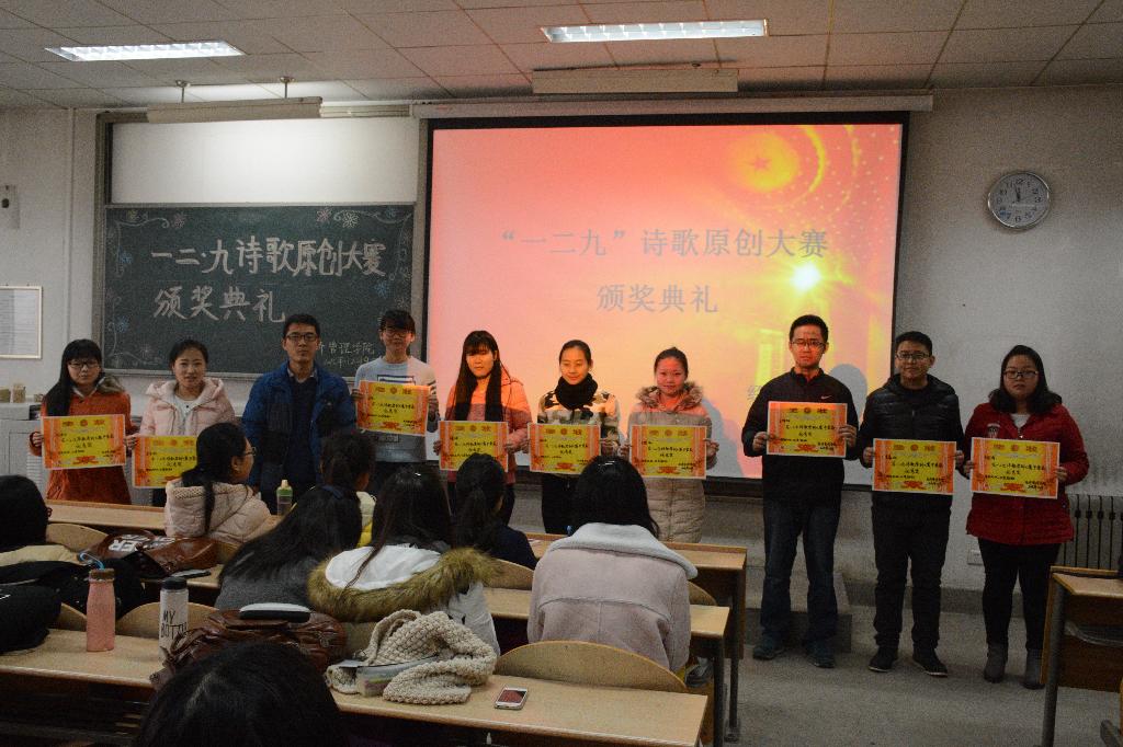 为了培养同学们的爱国意识,鼓励同学们继续保持对诗歌创作的热情,加深大家对一二九运动的认识,我院2014级举办了“一二·九”诗歌原创大赛,并于12月9日在教2--212顺利举行了活动的颁奖典礼。此次典礼由14级辅导员张玉玲老师主持,出席并参加本次典礼的还有14级辅导员刘雷波老师以及大二所有参赛的同学。
