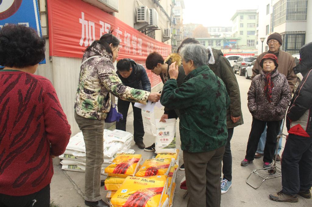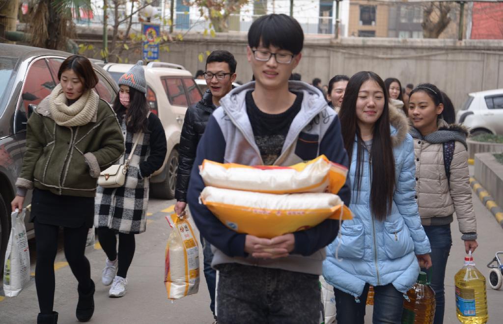 2015年12月15日,西安工业大学艺术与传媒学院近200名大学生志愿者协助校工会和离退办,帮助年事已高的退休教职工将年终福利米、面、油等搬到家中。