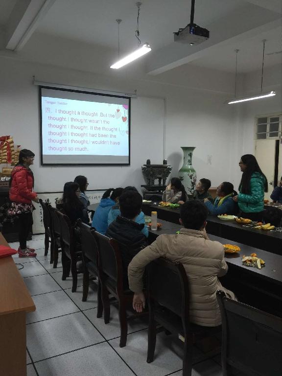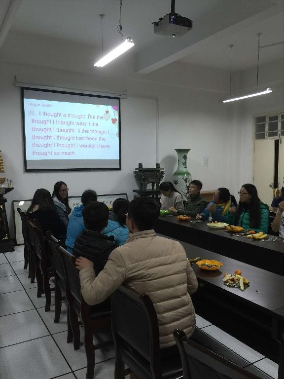 12月9日晚,在教5-413,一群英语爱好者聚集在一起参加了“爱英社”本学期最后一次活动。一学期以来,“爱英社”给全校英语爱好者提供了一个学习英语的场所,通过丰富多彩的活动让学习英语的过程变得轻松有趣,而“爱英社”提倡的全英文交流也有力地促进了同学们英语口语水平的提高。