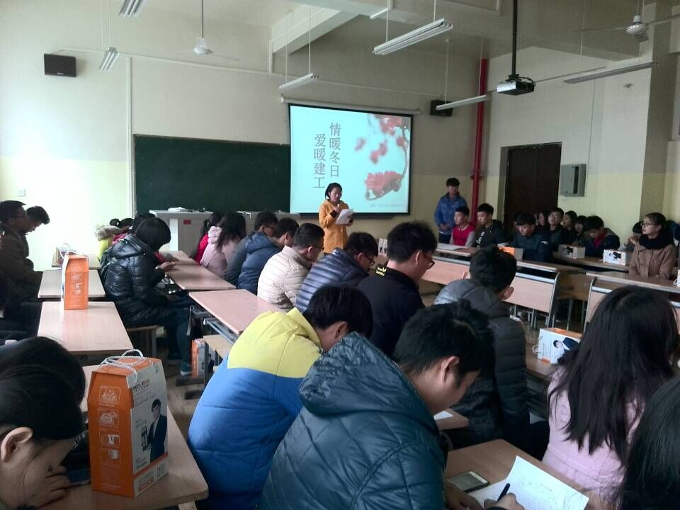 1月5日,建筑工程学院阳光助学协会在工4-202组织开展了“爱暖冬日,情暖建工”活动。学院党委副书记张艳霞、各年级辅导员和家庭经济特殊困难学生参加了此次活动。