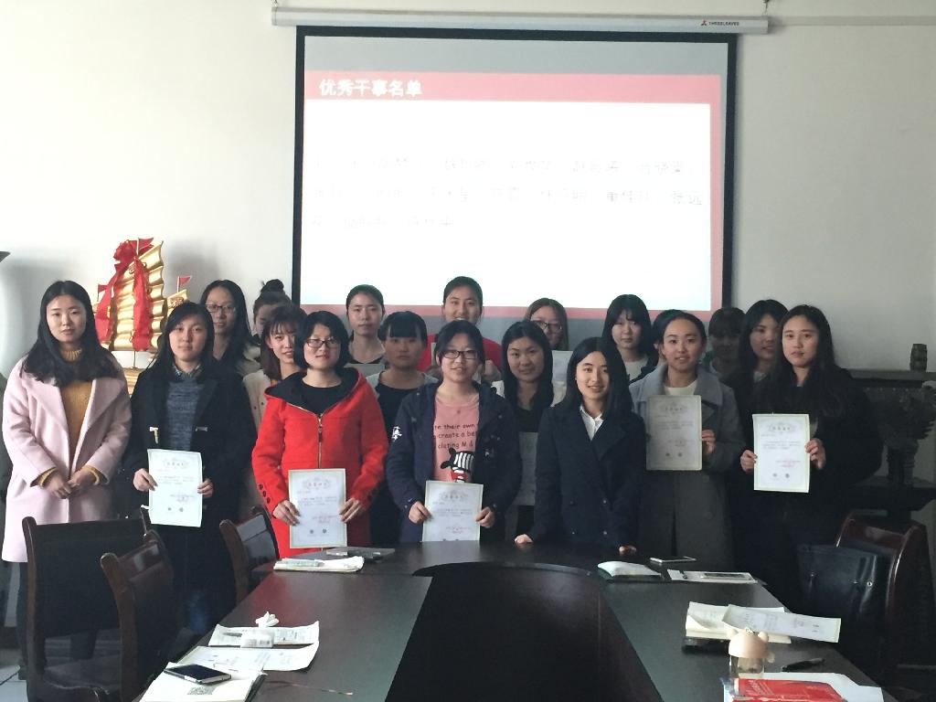 首先,学院主席团成员为在上学期部门考核中获奖的文宣部、实践部等部门颁发获奖证书。接着,对上学期工作认真,表现突出的干事给予鼓励,颁发证书,胡梦恬等干事上台领奖并合影留念。随后,朱文璟同学向团学成员们传达了校学生会本学期活动的主题及计划,并根据学院的具体情况对活动的大体内容时间与成员们进行了商讨,确定了本学期我院团委学生会的各项活动。最后,曹翠然同学对近期要举办的外文配音大赛的具体事项进行了的说明与介绍。
