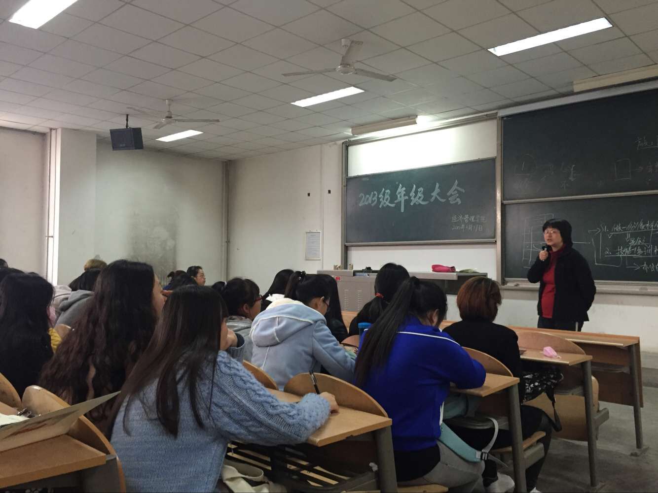 3月17日中午,经济管理学院2013级2016年度第一次年级大会在教1-103、1-104教室顺利召开,本次会议由13级辅导员曲峡、侯剑波老师主持。会议内容主要针对13级学生进入大三下学期,即将面临毕业的情况提出一些建议措施,帮助并督促同学们提高自身综合素质。