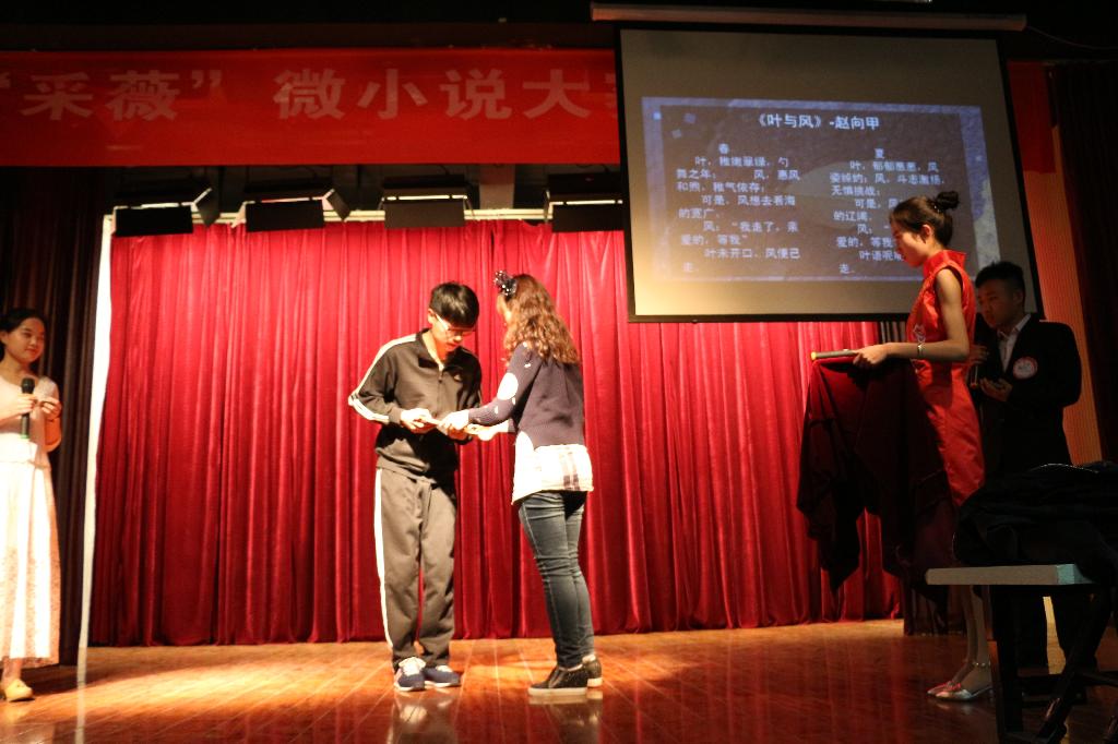 伴随着渺渺采薇音乐的响起,一首歌舞表演《采薇》正式拉开了颁奖典礼的序幕。两位主持人用幻灯片为大家展示了微小说大赛的全过程。根据网络投票量显示,成逗同学的《像芭蕉理解雨,我理解了你》以491票荣获最具人气奖,唐定莹同学的《催眠》荣获最具创意奖,还有朱春燕等5位同学的作品荣获本次大赛的优秀奖。梁安慧作品《如常》、何丽媛作品《此生不换》和赵向甲作品《叶与风》分别斩获本次大赛的一、二、三等奖。他们的获奖作品虽然为不同风格,但都以细腻的笔触、真实的感情和唯美的景物描写带给读者耳目一新的感受,获得学生和教师评委的高分通过。