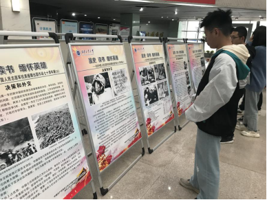 在图书馆二楼大厅,同学们先后参观了抗美援朝图片展、抗美援朝历史研究的图书等资料,通过驻足学习翻阅双方高级将领回忆录、亲历者的回忆评述、中外军史专家的相关研究、经典战例、美国方面的解密档案、双方使用的武器资料以及有关抗美援朝的文学作品等书籍文献详细了解了70年前的峥嵘岁月里志愿军将士保家卫国的可歌可泣的历史,深切缅怀在这场共和国奠基之战中用血肉之躯筑起共和国钢铁长城的“最可爱的人”。