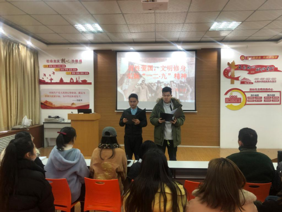 首先,杨老师带领大家重温了“一二·九”运动的历史背景,介绍了“一二·九”运动对抗日民族统一战线建立的历史意义,并指出“一二·九”运动不但是学生运动史上的光辉篇章,也是动员全民族的运动,在新的时代,它也赋予了我们党员同志新的使命。随后,孙意鑫和李佳旺两位同志现场进行诗朗诵——《纪念一二九运动》和《历史的风》,激发了党员同志的爱国热情,展现了党员同志奋发激昂的精神面貌。