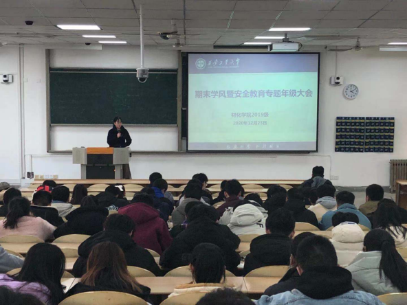 为做好我院2019级期末学生管理相关工作,进一步落实学校关于寒假安全管理工作相关要求,2020年12月23日,材化学院2019级于教1-301和302教室召开期末学风暨安全教育专题年级大会,2019级学生辅导员乔娜、徐慧子,2019级全体学生参加会议。