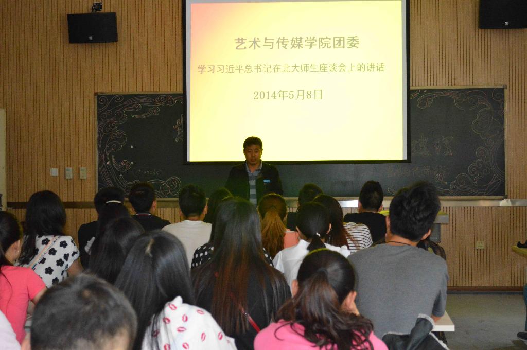 为深入贯彻学习习近平总书记的重要讲话精神,引导广大团员青年自觉践行社会主义核心价值观,2014年5月8日,艺术与传媒学院团委在教4-201组织学习习近平总书记在北大师生座谈会上的讲话,我院全体学生干部参加了学习会并交流了各自体会。