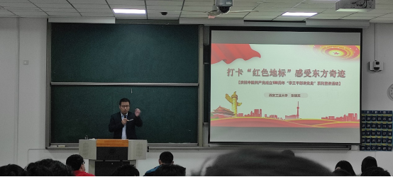 讲座伊始,张老师点出红色遗址对于感受我党的精神命脉的重大意义。随即讲解到红色地标是百年党史最鲜明的历史见证,从1921年在上海兴业路102号宣告中国共产党的成立,再到1935年在贵州遵义的生死转折,再到1949年在北京天安门庄严宣告“中华人民共和国在今天成立了”。张老师讲述红色遗址背后的故事引得同学们阵阵掌声,发人深省。最后张老师引申到学习党史的重要意义,习近平总书记强调,我们党历来重视党史学习教育,注重用党的奋斗历程和伟大成就鼓舞斗志、明确方向,用党的光荣传统和优良作风坚定信念、凝聚力量,用党的实践创造和历史经验启迪智慧、砥砺品格。本次活动至此圆满结束。