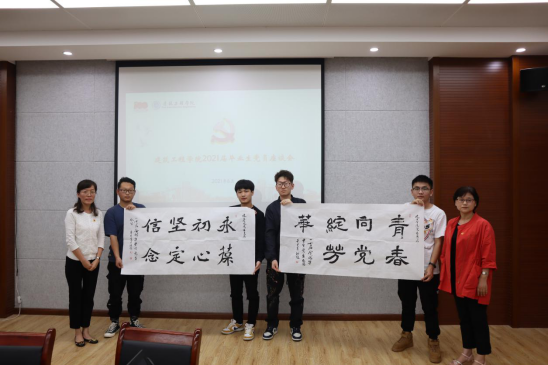 会上,大家一同观毕业季MV《和光以往》。随后,毕业生党员们从思想、学习、工作、生活等方面分享自身成长历程,表达了对母校教育培养的感激之情,并表示在未来的工作岗位上将继续发挥好党员先锋模范作用,踏实工作,积极奉献。学院领导们分别发言,勉励同学们在未来的工作岗位上不忘入党初心,时刻牢记党员身份,积极服务奉献。学院党委书记张英向与会毕业生党员顺利毕业就业表示祝贺,对他们为学院事业发展所付出的努力与理解支持表示感谢,并提出了三点期望:一是坚定信念有追求,进一步坚定政治信仰,努力做好本职工作。二是心有底线敢担当,在未来的工作生活中要保持昂扬向上的奋斗意志和积极乐观的心态。三是脚踏实地干成事。同时,她希望同学们及时向母校分享个人成绩,欢迎同学们常回家看看。毕业生党员代表向学院赠送书法作品,表达对学院和母校的感激之情。最后,白洋带领全体毕业生党员重温入党誓词。铮铮誓词再次提醒毕业生们要时刻铭记党员身份,坚定理想信念,努力践行党员义务。