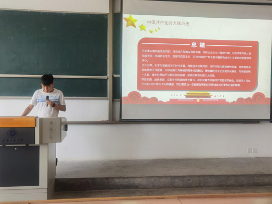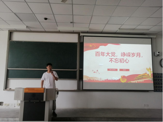 首先,由张清华为大家讲述了革命先烈贺炳炎的故事,提出学党史、强信念、跟党走三点,希望各位班干部们积极学习革命先烈身上不怕险阻,一心为国的精神,充分发挥团干部的作用。接着,鲁一妠为大家讲述了蔡和森同志与毛泽东同志共同建立中国共产党的过程,介绍中国共产党人为中国人民谋幸福、为中华民族谋复兴的初心和使命,实现共产主义的最高理想和最终目标全心全意为人民服务的根本宗旨。最后她指出我们要以听党话跟党走的忠诚、坚忍不拔的意志和无私无畏的勇气,投入具有许多新的历史特点的伟大斗争,用攻坚克难的实际行动诠释新时代团员青年的使命担当。最后,17级毕业生刘安为大家讲述自己带来的党史故事。他从学习党史的意义入手,讲述了新民主主义革命、社会主义革命建设、改革开放和社会主义现代化建设三个时期中国共产党的艰苦历程,从党的成立到如今全面改革和对外开放,从星星之火到可以燎原,再到如今的百舸争流,历史事实雄辩的告诉我们,没有共产党就没有新中国!在讲述的结尾,他希望各位可以抓住机遇,加快发展,实现中华民族的伟大复兴,在新的世纪继续谱写出更加壮丽的篇章!