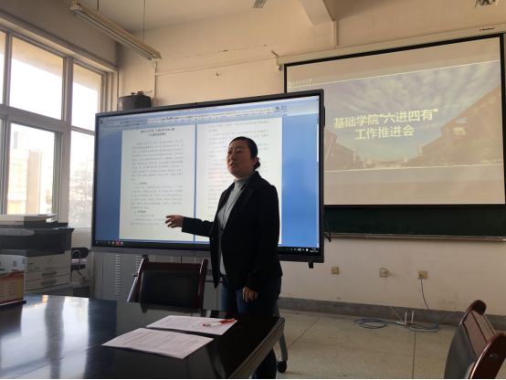 2021年11月9日中午12点,基础学院在教6-412召开“六进四有”工作推进会。会议由基础学院党委副书记张艳霞主持,全体辅导员、研究生辅导员和各年级六进四有负责人参加会议。
