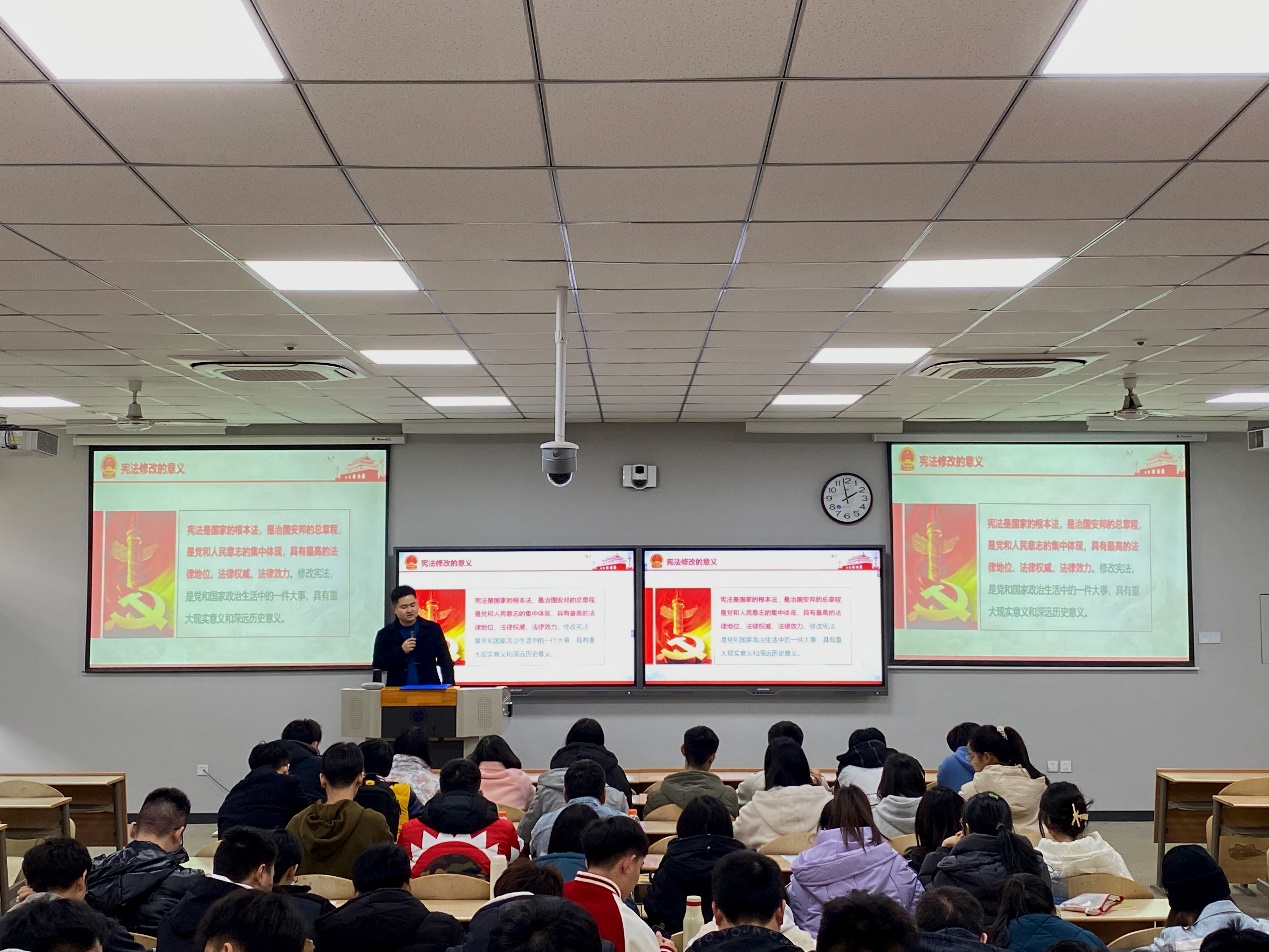 12月3日上午,学院各年级以“百年新征程,晨读明宪法”为主题,开展第八届国家宪法日“宪法晨读”活动。学院各年级充分发挥课堂主渠道作用,利用形势与政策课程休息时间组织学生通过普法网观看直播、同步参与活动,集体在现场同步跟读。随后,老师带领同学们回顾了中国共产党的百年峥嵘岁月、回顾中国法治建设的一程又一程,围绕国家宪法日开展专题学习。在活动中体会宪法温度、感受宪法力量。