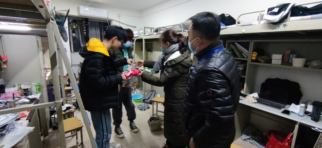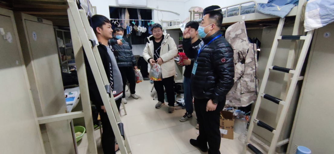 翟超与专班辅导员代表学校对四公寓学生进行了慰问,发放新年礼包,小小的礼包承载着学校对同学们的关怀和温暖。翟超祝同学们元旦快乐,感谢同学们对疫情防控工作的支持,并表示在大家的共同努力下困难终将会被克服。