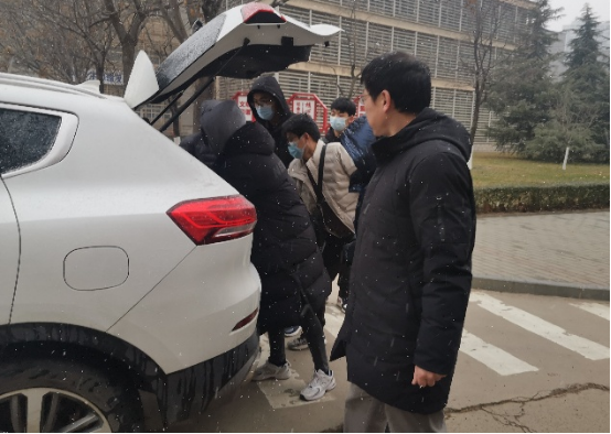 21日早晨,未央校区突然降温,天空开始飘雪。学院教师王洪喜、付雷杰、祝强三位老师在寒风中提前到达图书馆前,等候去往周至县、鄠邑区、蓝田县的8名学生。接到学生后,几位老师帮学生搬运行李,提醒带好证明材料和随身物品,亲自驱车护送学生返乡,让学子们感受到了“家”人般的温暖。