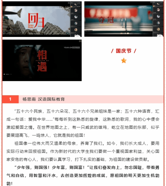节假日期间组织学生观看《我和我的祖国》并展开在线座谈,新中国筚路维艰的奋斗历程深深打动和激励着青年学子。“让青春烈火燃烧永恒,让生命闪电划过天边,用所有热情换回时间,让年轻的梦没有终点!”张露同学在观影后说非常喜欢《烈火青春》里面的这段话,她满怀豪情地说:“青春就应该燃烧,发出亮光才有价值!而我生在华夏,愿祖国越来越繁荣昌盛!祖国的未来,由我们接力奔跑!”通过主题观影,号召广大青年缅怀烈士功绩,奋发成才,立志报国,为实现中华民族伟大复兴贡献自己的力量。