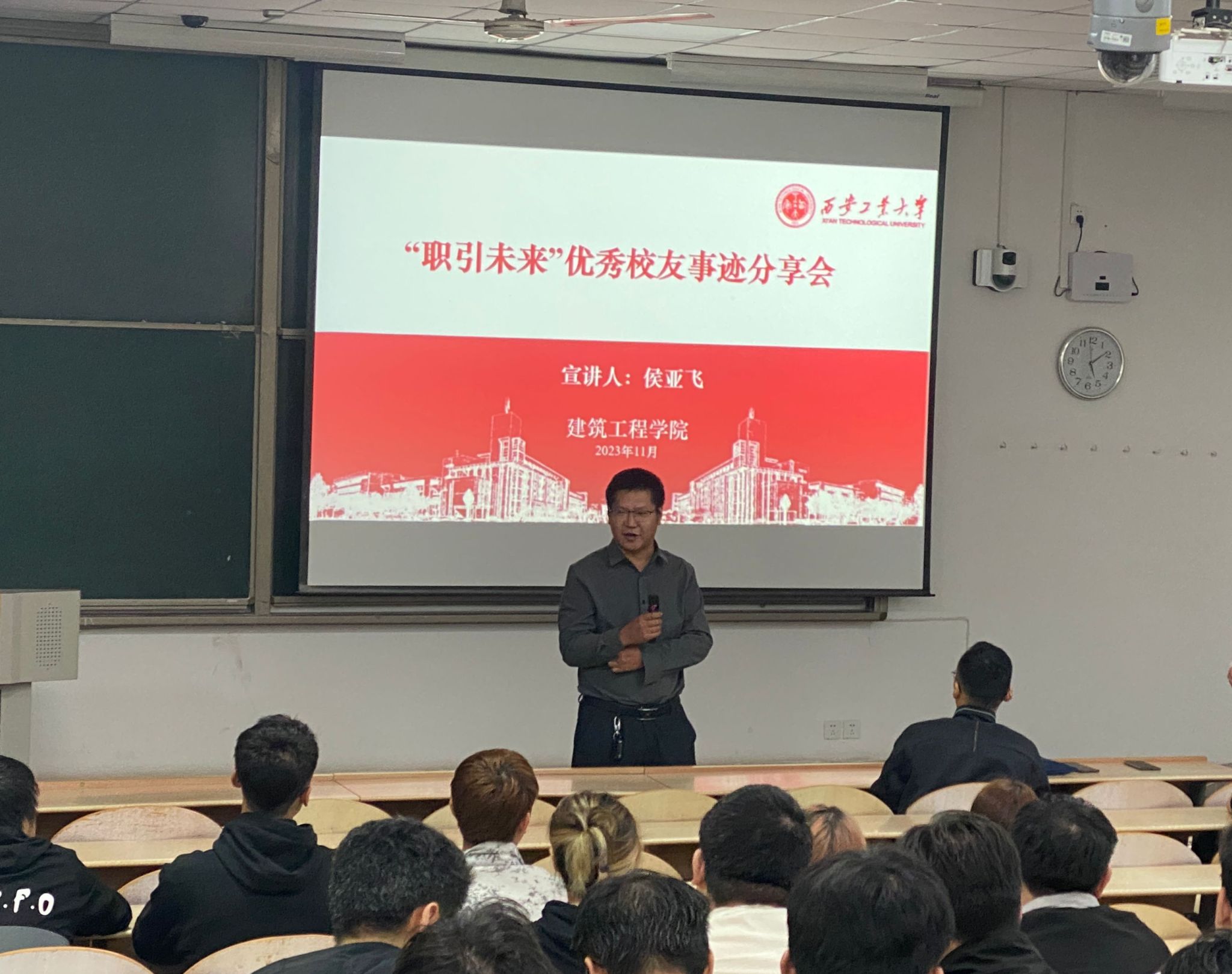 11月1日,建筑工程学院在教1-103举办“职引未来”优秀校友事迹分享会。学院2006届土木工程专业校友、陕西建工机械施工集团有限公司国际工程公司书记侯亚飞师兄作为主讲嘉宾,与150余名在校学子们分享他的求学、工作经验和人生感悟。
