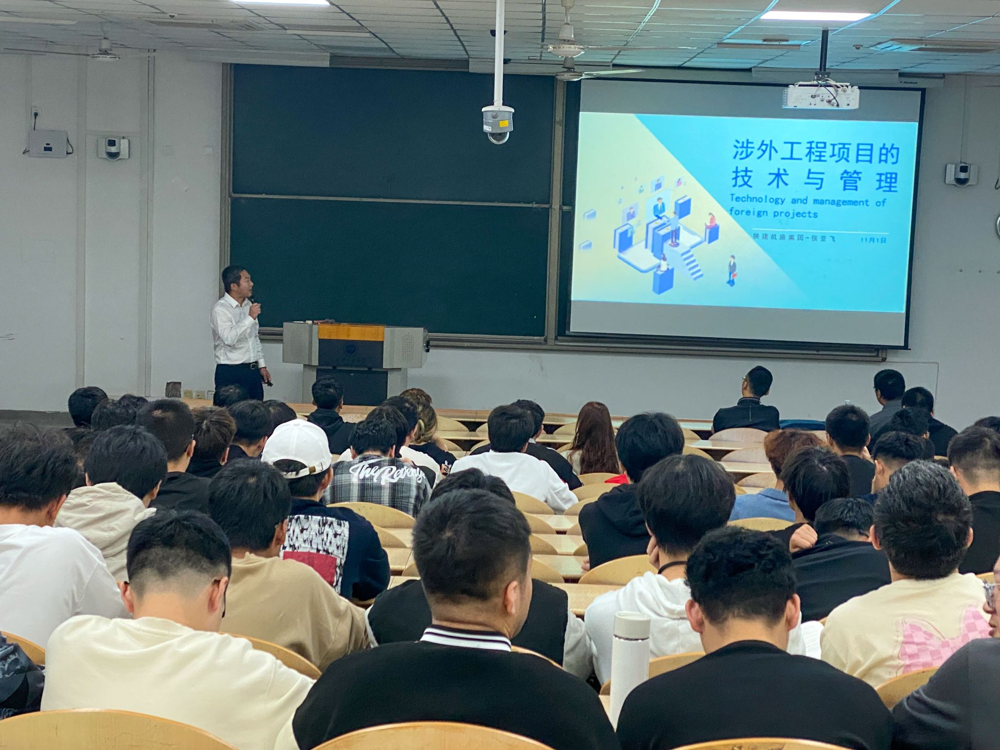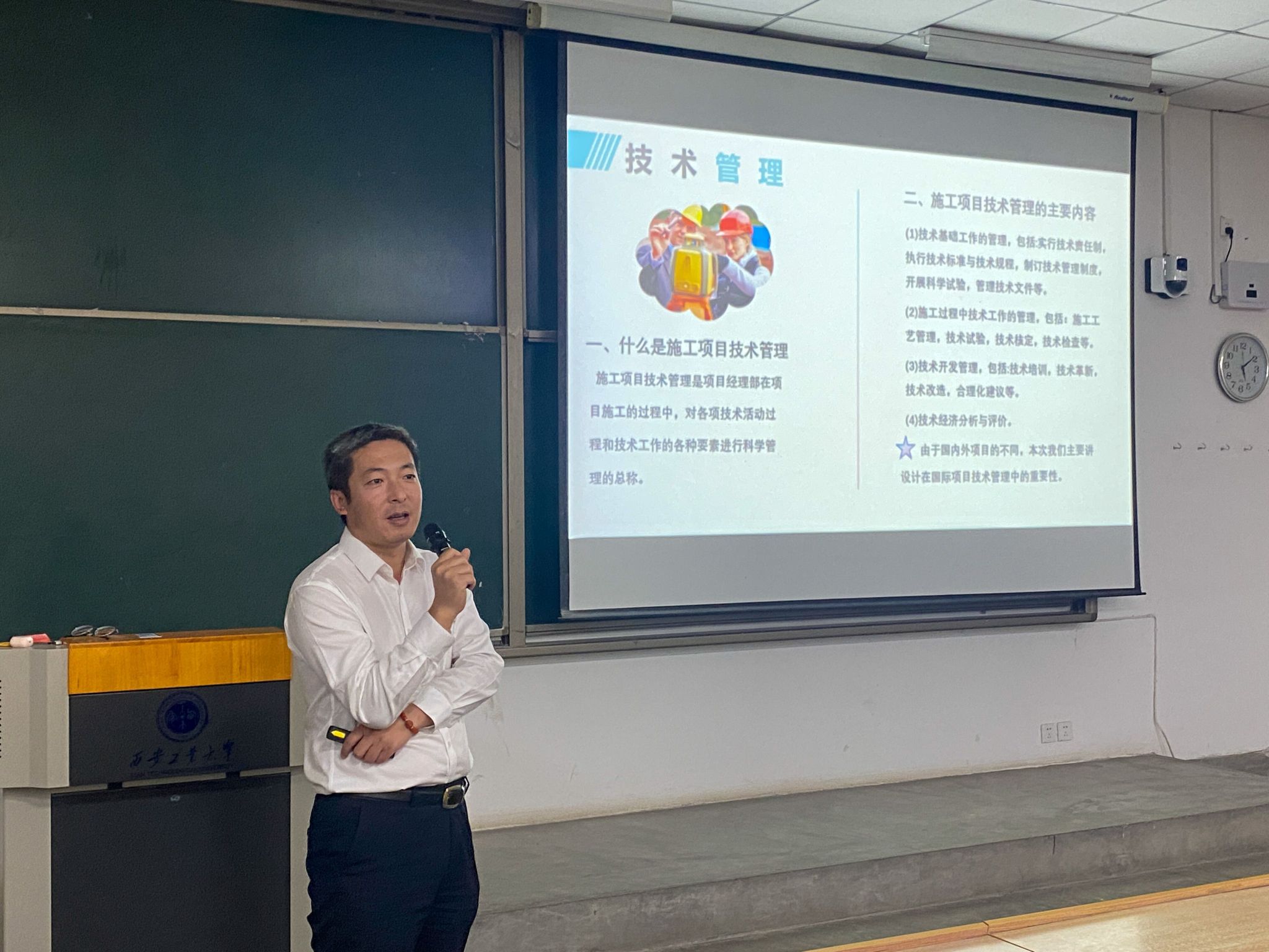 接下来,校友侯亚飞向与会师生作了题为“涉外工程项目的技术与管理”的分享。他结合自己的求学经历和工作经验,从项目概述、技术管理、合同管理、施工管理、人员管理五个方面进行讲解。其中,对技术管理与合同管理做了重点阐述。