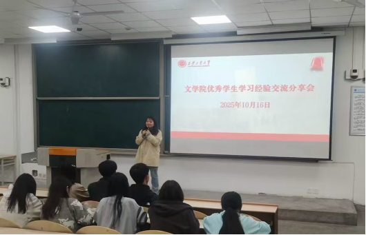 为帮助 2024 级学生明晰学业方向、规划成长路径,10月16日晚,文学院在教1-101举办优秀学生学习经验交流会,会议由文学院2024级学生辅导员王丹丹主持,2022 级李文妍、林翔翔、段念群、苏亦菲4名本科生及研究生王晔作为分享嘉宾,为 2024 级全体学生进行了学习、求职及实践经验分享交流。