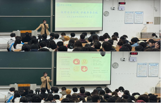 为强化大学生安全防范意识,筑牢校园安全防线,11月20日,光电工程学院组织2024级召开“筑牢安全防线 护航青春启航”主题年级大会。此次大会由辅导员蒋紫洮主持,2024级全体学生参会。