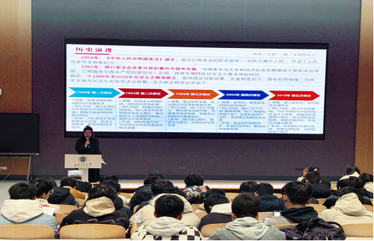 王朦月老师围绕宪法的根本地位、历史发展、青年关联、实践要求及政治与法治关系等方面展开讲解。她指出,宪法是国家的根本法,是治国安邦的总章程,与每位青年的成长发展密切相关。王老师结合宪法条文与学生实际,重点阐释了公民的基本权利与义务、宪法与国家主权、劳动与就业保障等内容,引导学生理解宪法精神、树立法治观念;并强调,青年学生应自觉成为宪法的崇尚者、遵守者和捍卫者,将宪法学习融入日常言行,在法治实践中锤炼品格、贡献力量。整场讲授内容详实、贴近实际,现场学生认真聆听、积极互动,反响热烈。