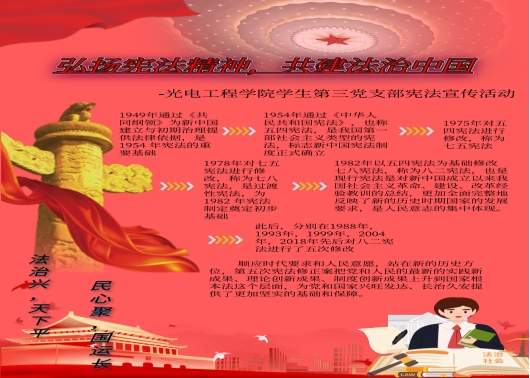 为深入学习宣传贯彻习近平法治思想,推动宪法精神深入人心,切实提升学院师生的法治素养与宪法意识,培育尊法学法守法用法的法治新人,光电工程学院学生第三党支部于12月25日开展宪法宣传主题活动。