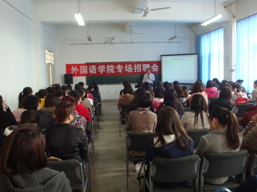 3月26日早上9时,应外国语学院副院长李雪梅教授邀请,坤德展地国际语言文化服务中心招聘会在我校教D501教室顺利举行。与会人员主要为我院08级日语专业、英语专业的毕业生,还有09级部分同学。担任此次主讲的是该公司人力资源部张部长和潘部长。