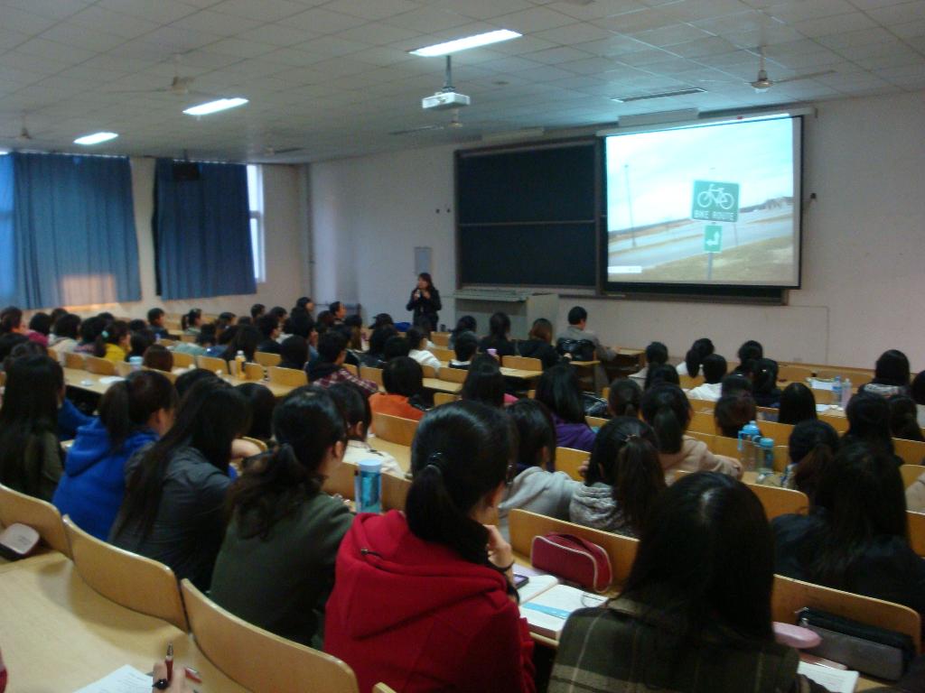 三位老师的中美文化差异讲座为我院学生读书特色活动再添亮点,尤其是刘改琳教授提倡学生在轻松愉快的环境中自主学习,她拍摄的大量精致照片成为讲座的亮点,其幽默诙谐的语言不时引得在场同学的阵阵笑声,讲座也就这样在轻松活泼的气氛中不知不觉地结束了。