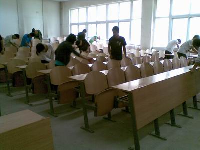 我院家庭经济困难学生组织利用中午休息时间义务劳动,对教室进行美容工作。从桌面到椅面、从地面到墙面均用洗衣粉进行清洗,也将在教室犄角旮旯的尘土惊醒清扫,经过这一番辛苦的擦洗,使教室环境焕然一新,变得十分干净整洁。同时利用课余时间宣传保护环境、杜绝在课桌上乱涂乱画的宣传。